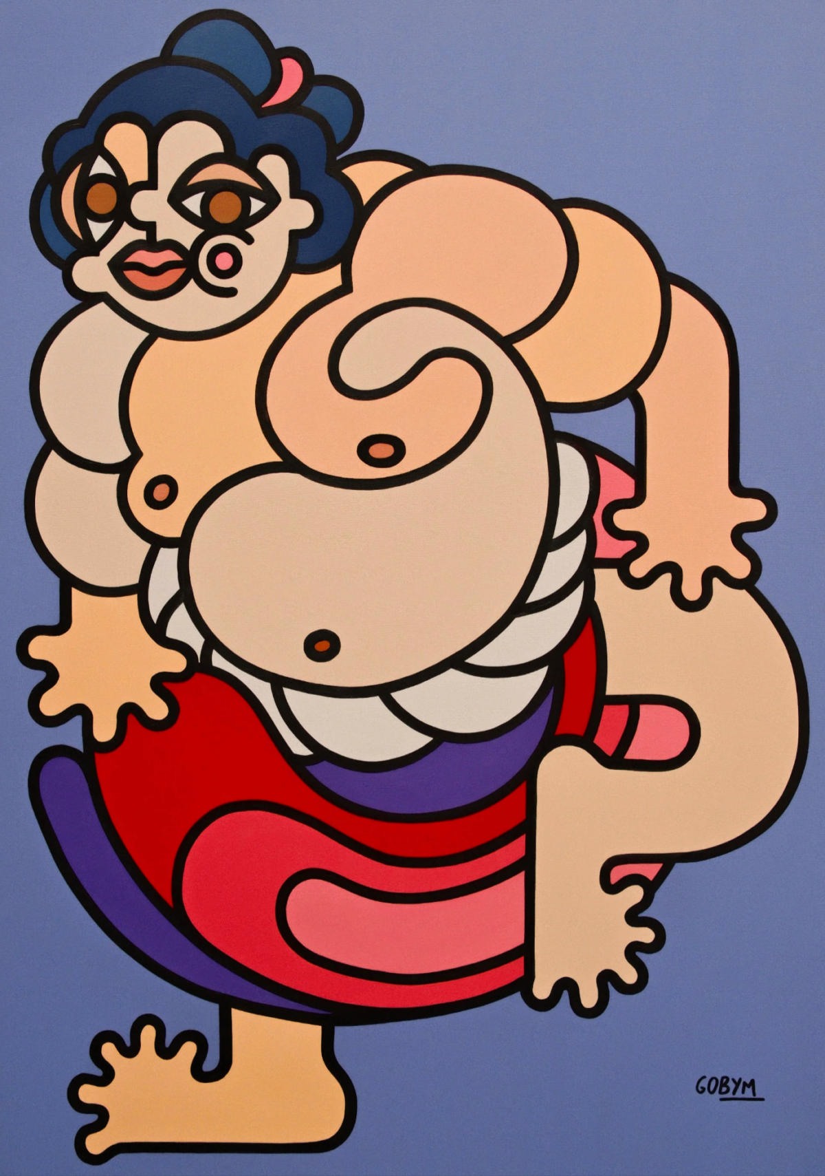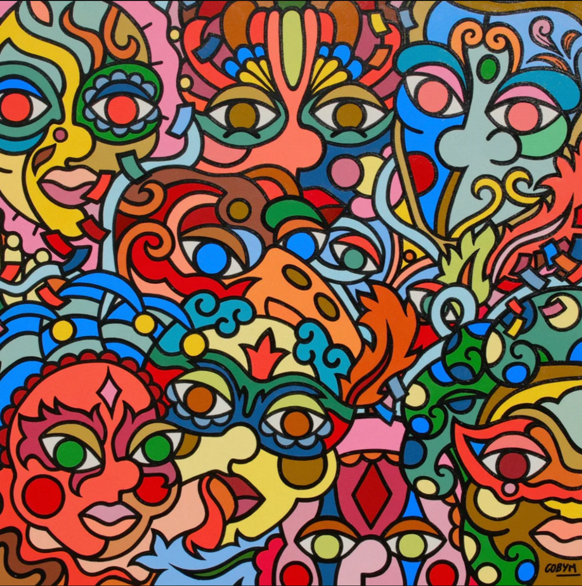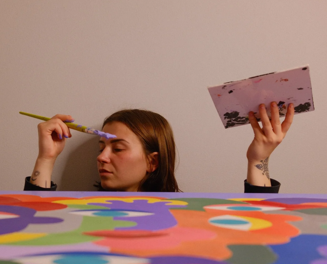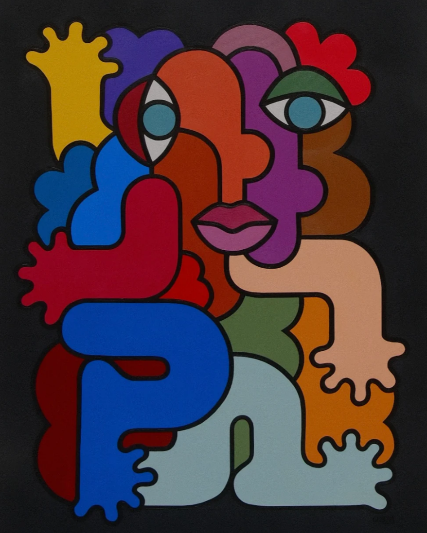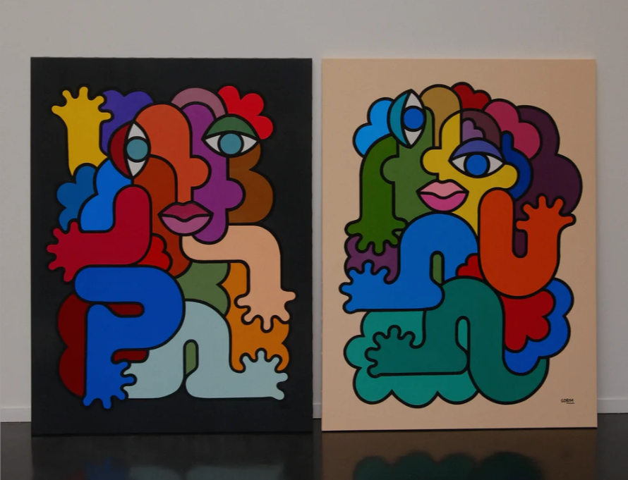 Elle peint des visages colorés qui s’emboîtent comme les pièces d’un puzzle. Son style forme presque un motif en mouvement, où chaque visage peut en dissimuler un autre. À travers cette mosaïque, elle explore la diversité et cherche à créer un univers accessible, dans lequel chacun peut se reconnaître.